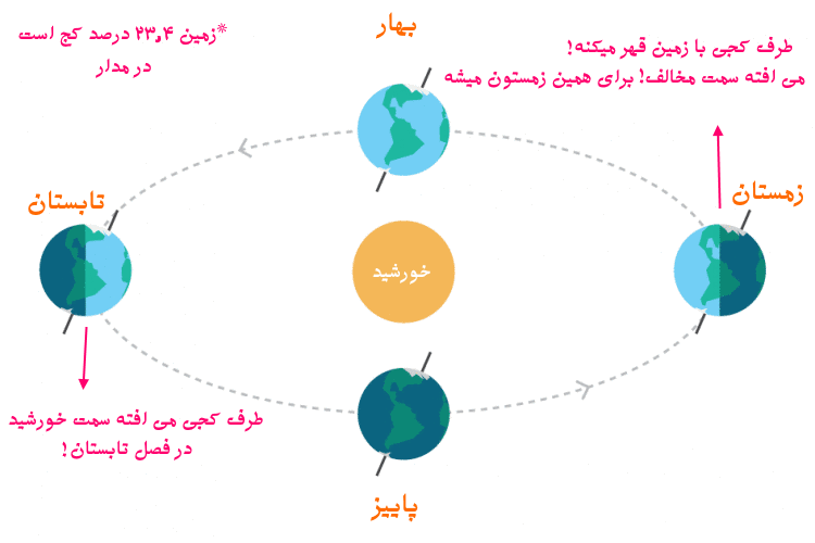 زمین در مدار خود در حال چرخش به دور خورشید است! و این چرخش 365 روز طول میکشد! اما زمین به حالت 90 درجه یا 0 درجه نسبت به خورشید نیست! بلکه در مدار خود کمی کج است و زاویه ان 23.4 درجه است. همین کجی در طول چرخش زمین به دور خورشید،یک بار به سمت خورشید است!(شروع فصل تابستان) و یک بار جهت عکس خورشید می افتد(شروع فصل زمستان). دو بار نیز زاویه کجی ان مایل یا برعکس سمت خورشید نیست(دو فصل پاییز و بهار). توضیحات بیشتر اینجا elmbaarzesh.ir/Matlab.php?id=64